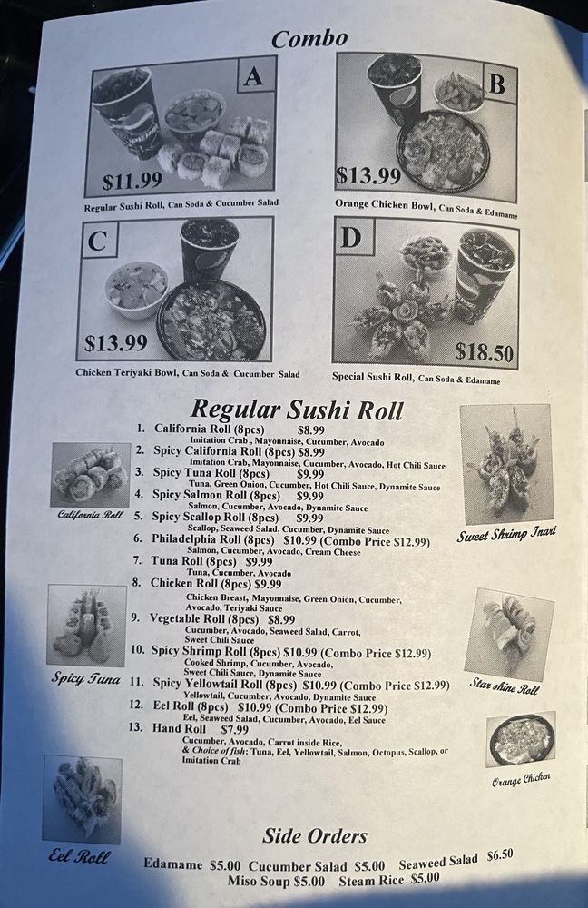 Choice of fish: tuna, eel. Shrimp, yellowtail. Salmon, squid. Octopus, scallop, clam.